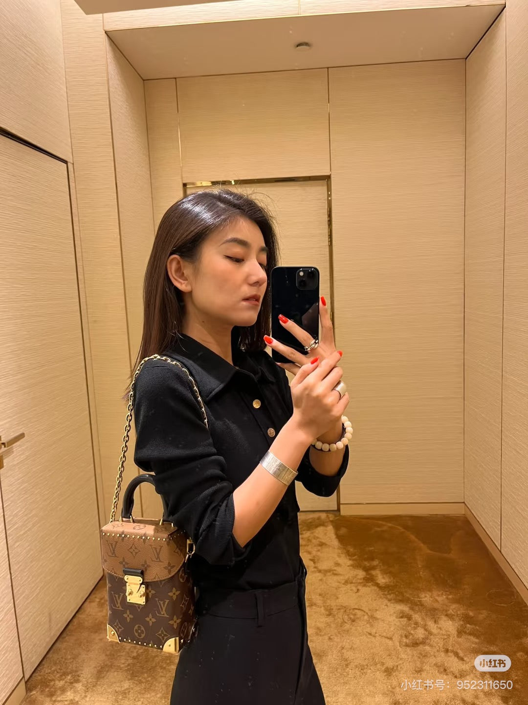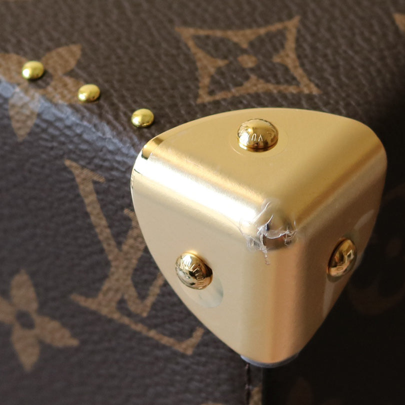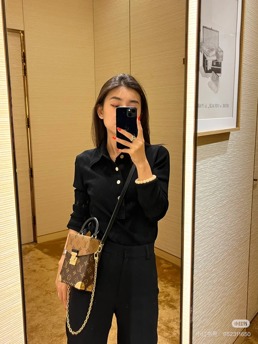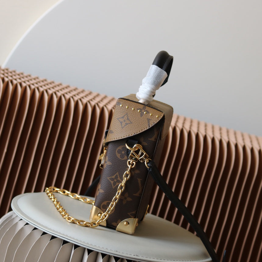 The Camera Box handbag combines all the Petite Malle’s signature details – S-lock, metallic corners, rivets, and a mix of Monogram and Monogram Reverse are all here – but on a modern shape. A thin gold-color chain brings a feminine touch to the bag while the pivoting top-handle adds a comfortable carry option.