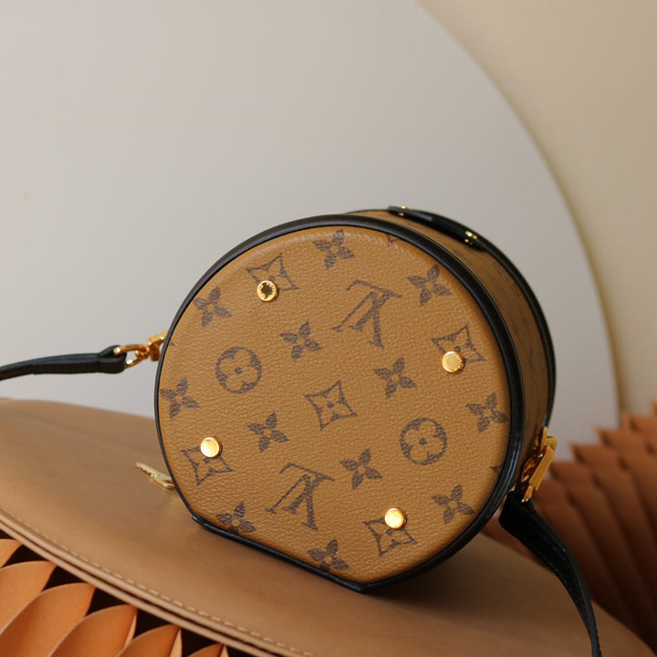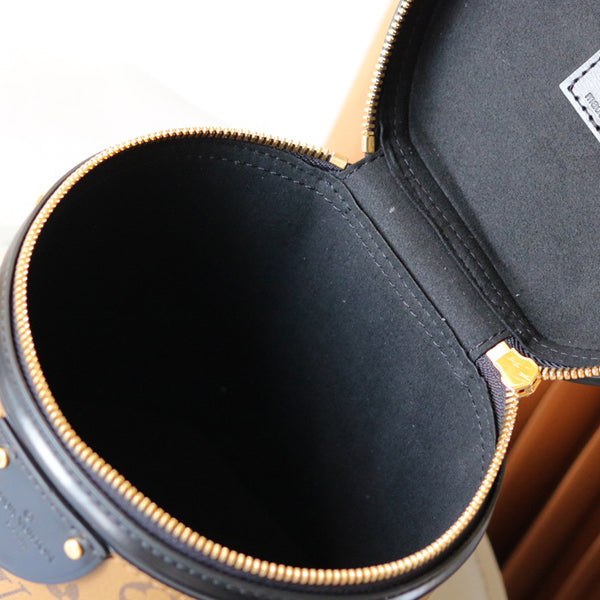 Featuring the historical shape of the LV Cannes beauty case, designer Nicolas Ghesquière revives a long-standing classic with the Cannes handbag. Petite in size and presented in a mix of Monogram and Monogram reverse coated canvas, the elegant piece reanimates a traditional silhouette steeped in Louis Vuitton heritage. A removable leather strap and top handle provide a range of carrying options.