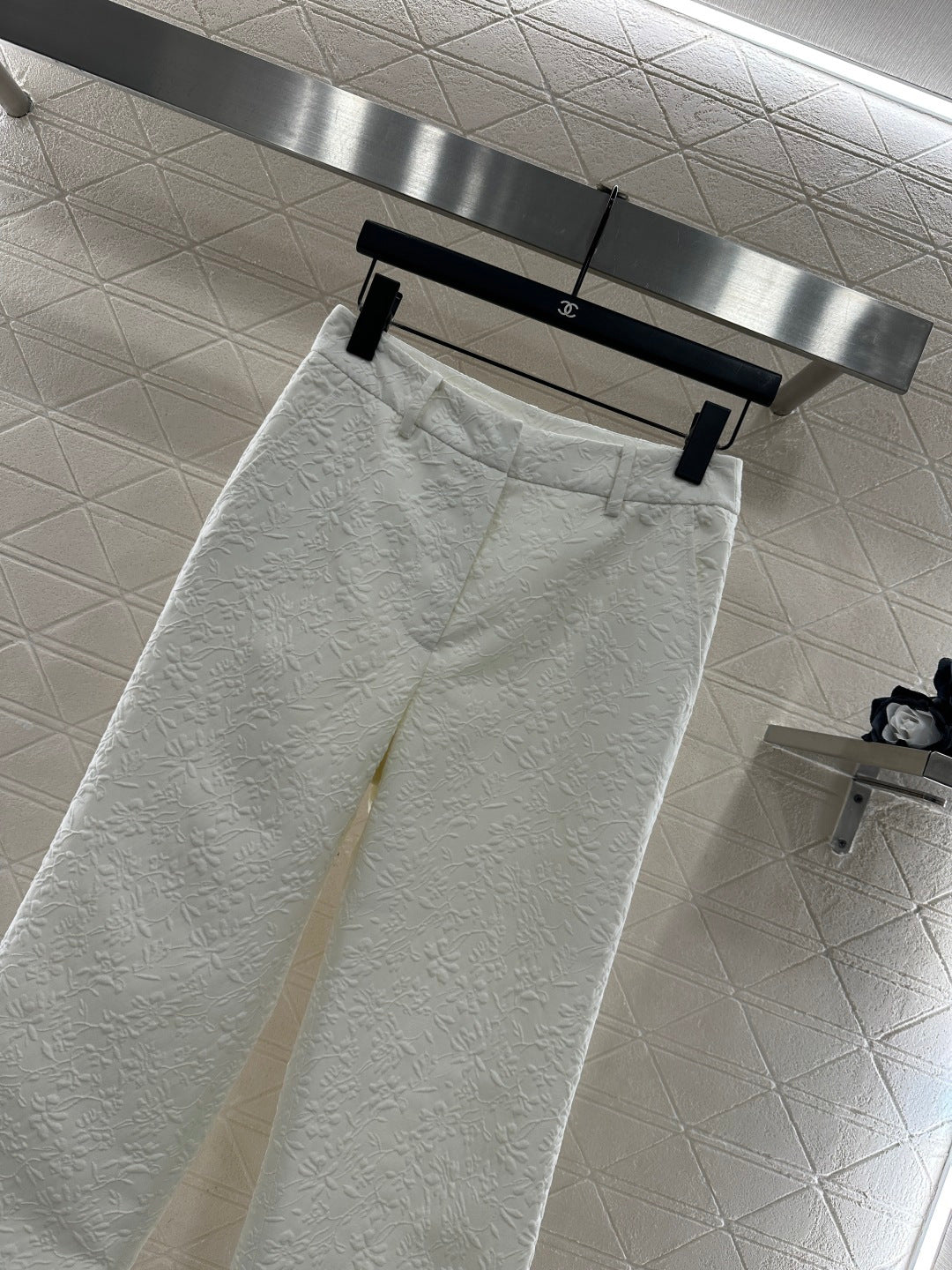 Dior double-layer stand collar tailored blazer with structured shoulders, sculpted cut, folded waistline paired with flared hem, cinched at the waist for a slimming effect. The inner side of the open front features a vest for a faux two-piece layered look. Paired with the matching straight-leg tailored trousers, the high waist echoes the embossed detailing, making the complete set even more elegant and eye-catching. Suitable for both commuting and attending important occasions, showcasing luxurious taste.