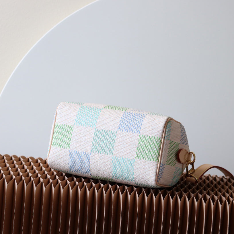 This Speedy Bandoulière 20 handbag is made from Damier Giant canvas in a fresh colorway that combines four different pastel shades, thanks to a precise digital printing technique. Inspired by the House’s classic travel bag, the distinctive shape has two rolled-leather top handles and a detachable and adjustable strap for shoulder and cross-body wear.