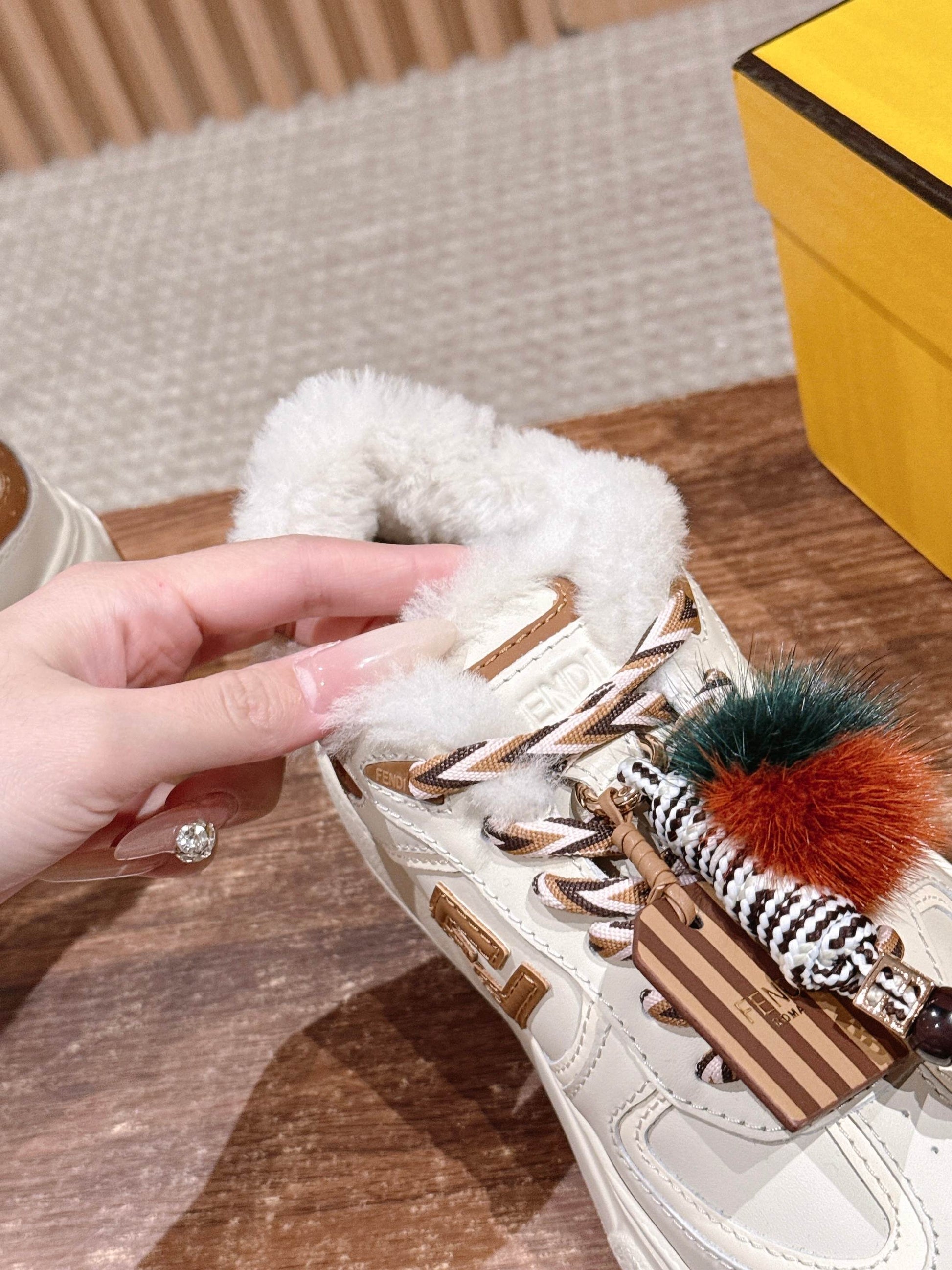 Fen new platform casual sneakers feature a similar silhouette but incorporate retro FF design elements. The upper is a combination of suede and leather, with a prominent double Flodge logo on the side. The wool lining makes them incredibly soft and lightweight, perfect for pairing with a sweatshirt for a youthful and stylish look.