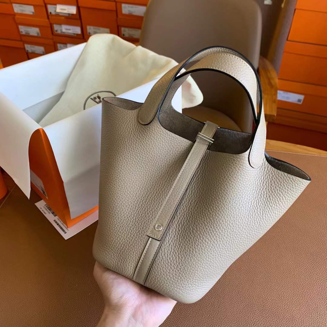 Hermes Picotin Lock 18 Turtledove Gray is made from high-quality full-grain leather, with a soft touch that preserves the natural grain texture. Every detail is meticulously handcrafted through hundreds of processes to perfectly replicate the original design. Using precise 1:1 craftsmanship, the shape, stitching, and metal fittings are identical to the original, accurate to the millimeter. It not only recreates the appearance of the original but also captures its essence, providing quality comparable to luxury retail standards. Each piece is a tribute to exceptional craftsmanship, designed for those who appreciate high quality.