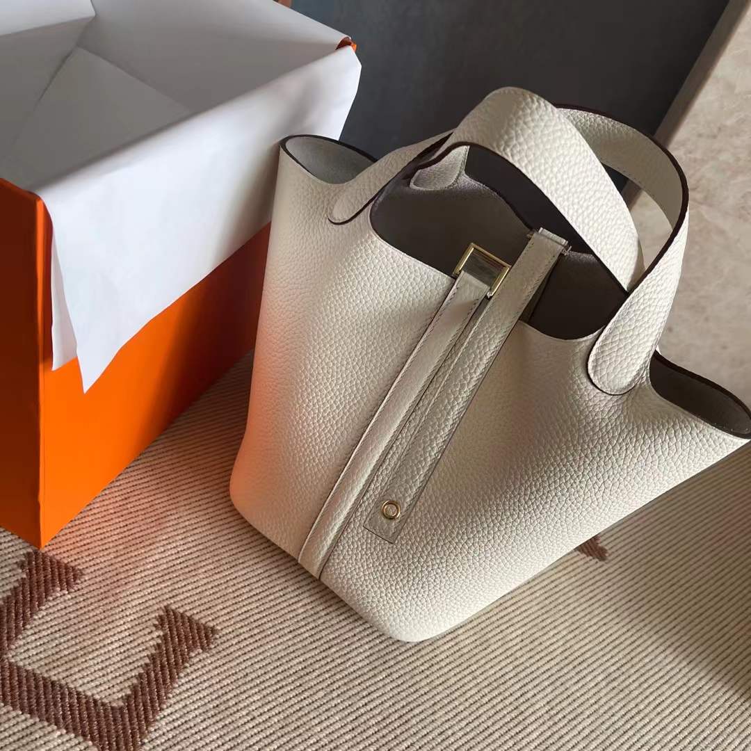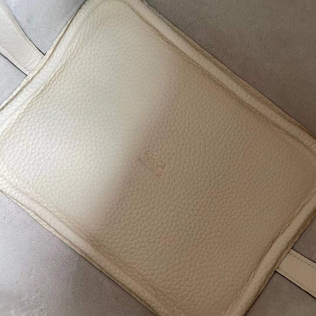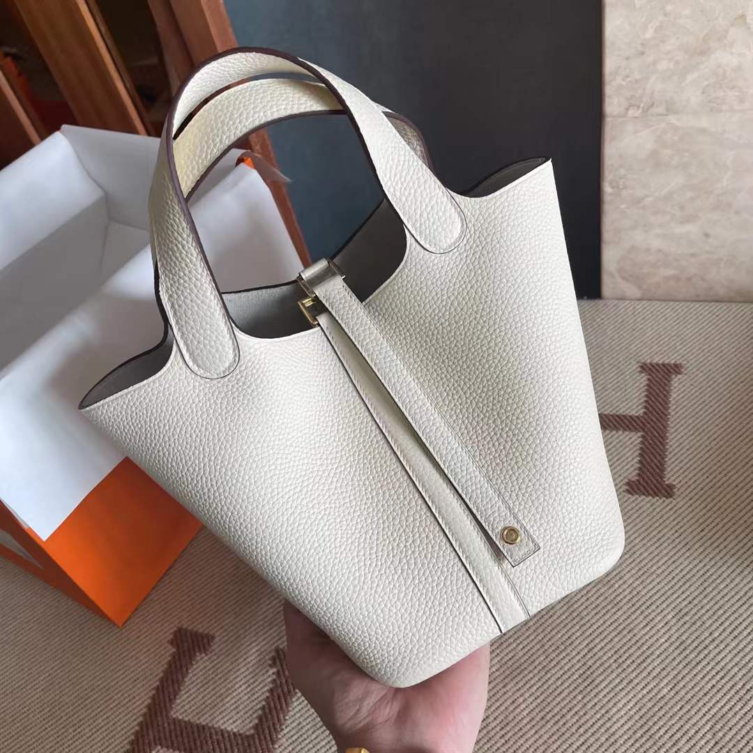 Hermes Picotin Lock 18 Cream White is made from high-quality full-grain leather, with a soft touch that preserves the natural grain texture. Every detail is meticulously handcrafted through hundreds of processes to perfectly replicate the original design. Using precise 1:1 craftsmanship, the shape, stitching, and metal fittings are identical to the original, accurate to the millimeter. It not only recreates the appearance of the original but also captures its essence, providing quality comparable to luxury retail standards. Each piece is a tribute to exceptional craftsmanship, designed for those who appreciate high quality.