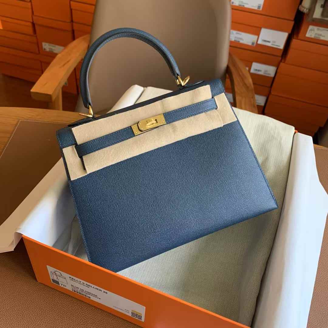 Hermes kelly25 Outer seam 7P duck blue is made from high-quality full-grain leather, with a soft touch that preserves the natural grain texture. Every detail is meticulously handcrafted through hundreds of processes to perfectly replicate the original design. Using precise 1:1 craftsmanship, the shape, stitching, and metal fittings are identical to the original, accurate to the millimeter. It not only recreates the appearance of the original but also captures its essence, providing quality comparable to luxury retail standards. Each piece is a tribute to exceptional craftsmanship, designed for those who appreciate high quality.