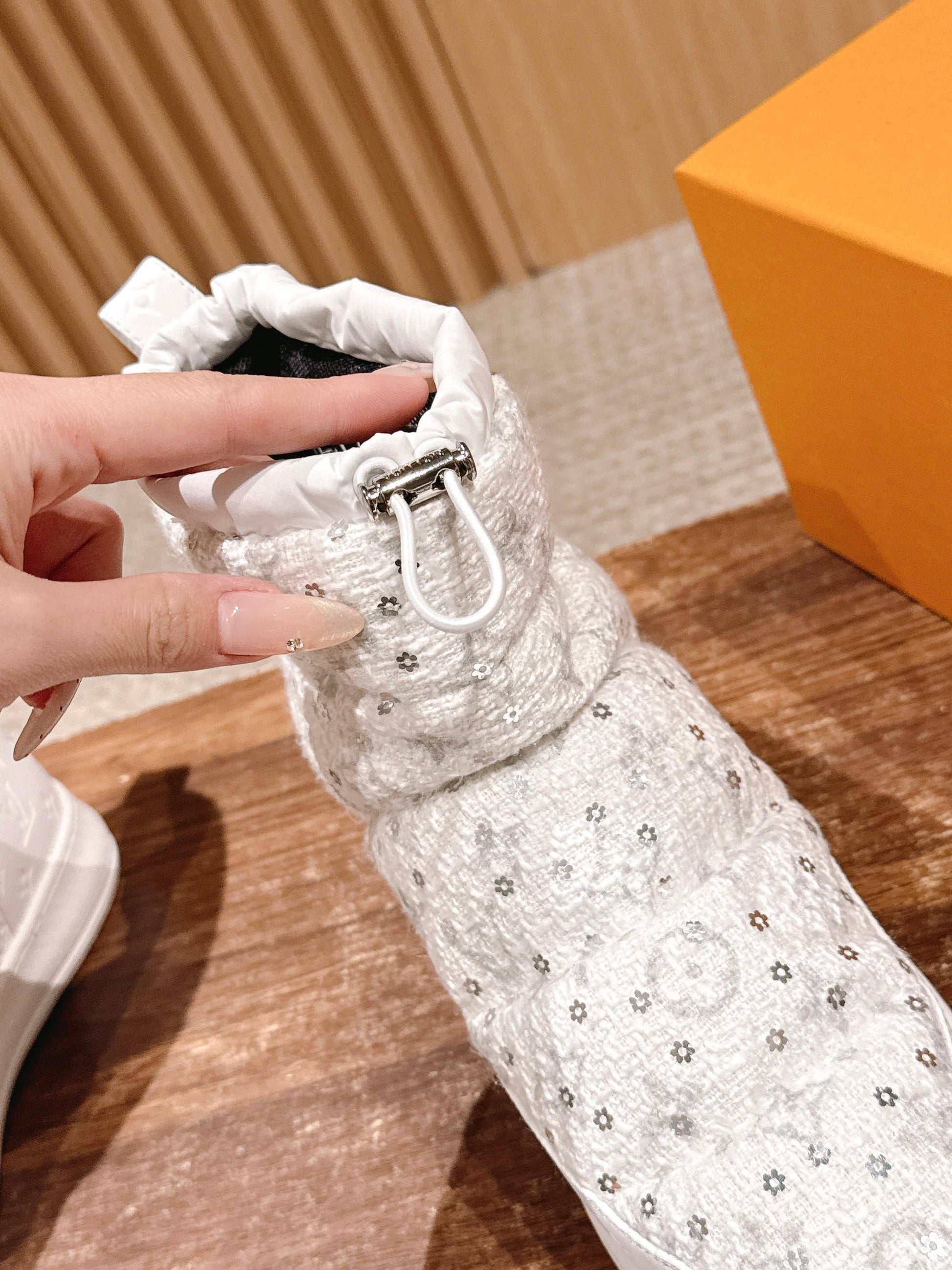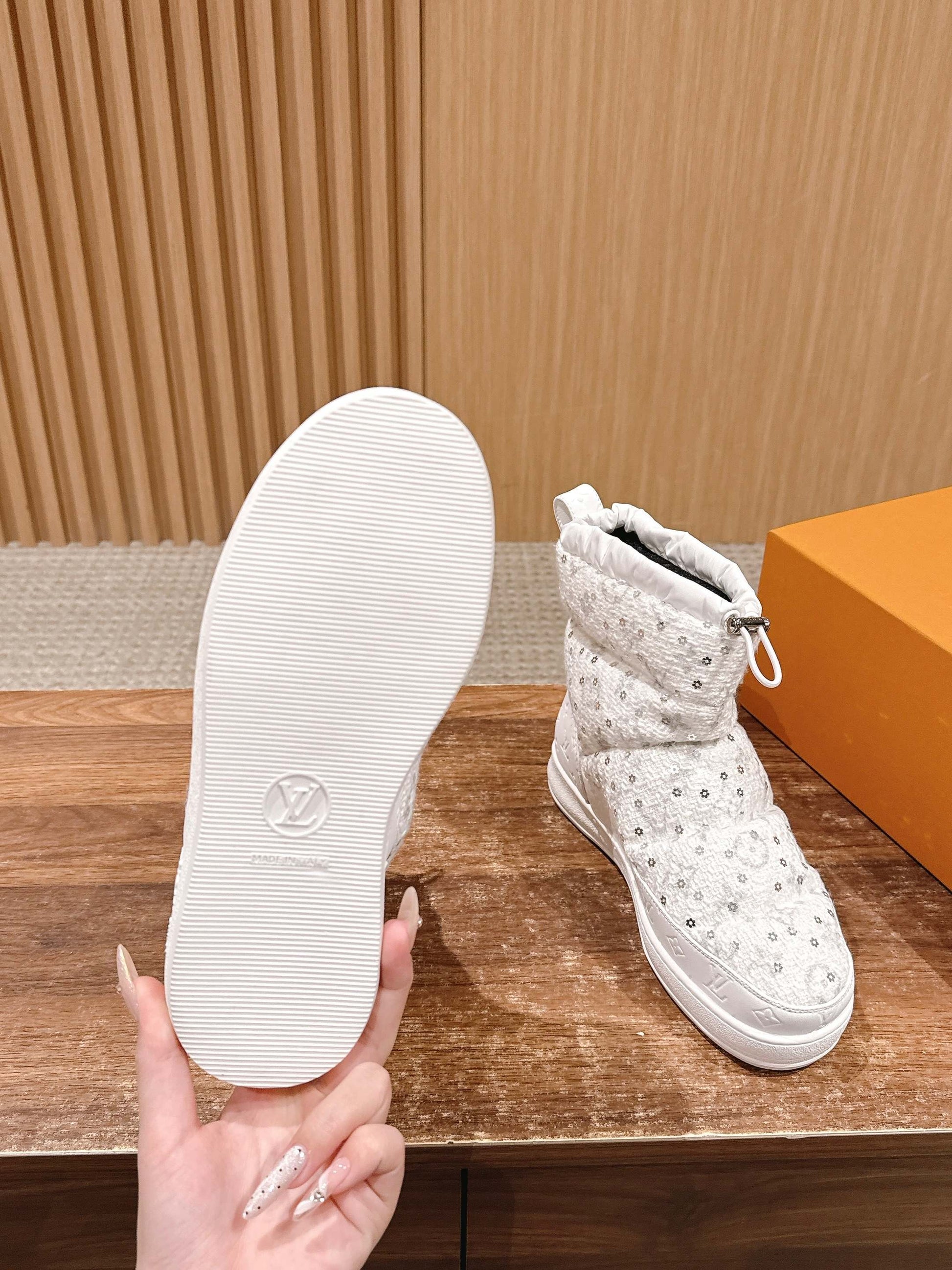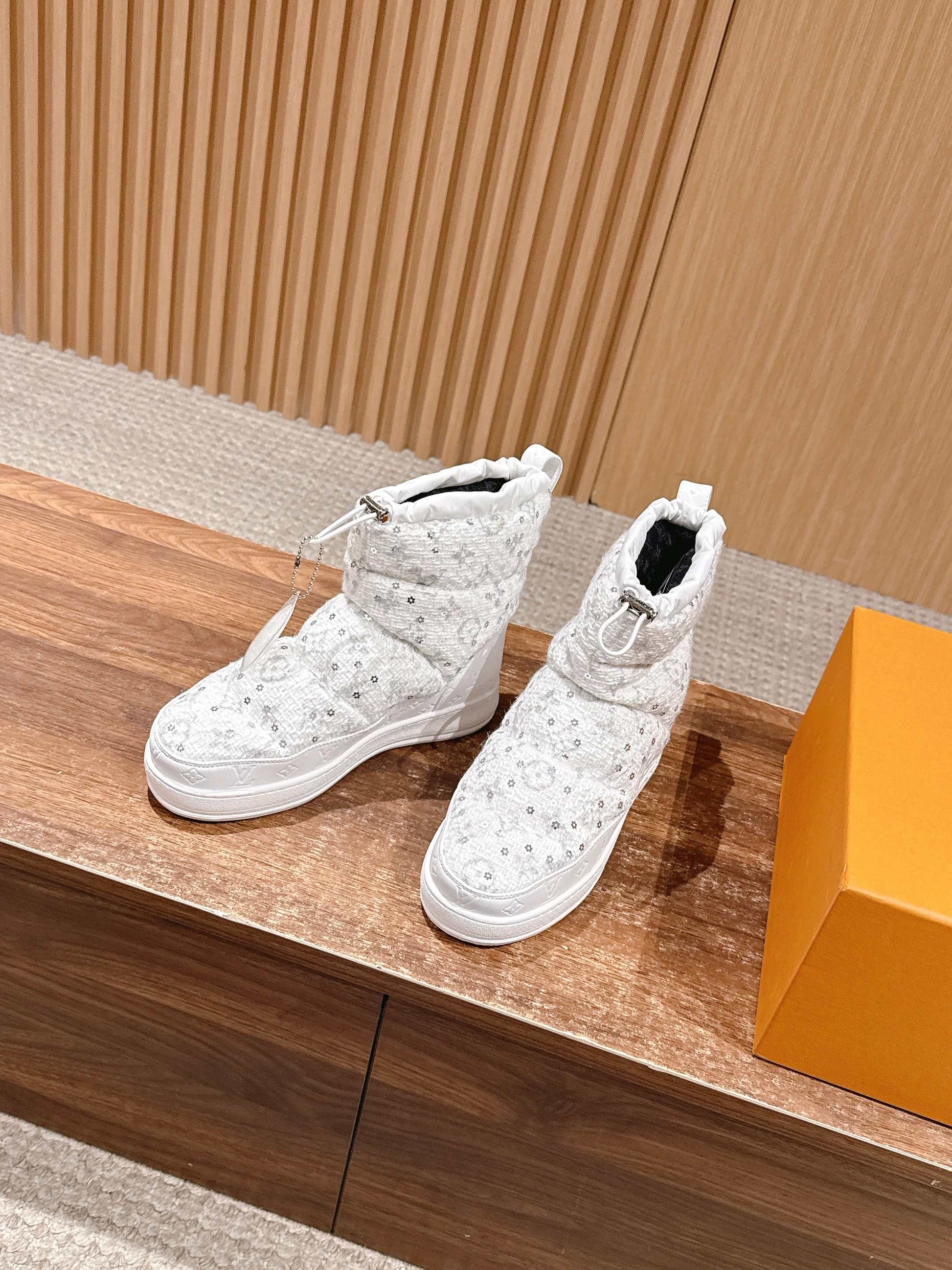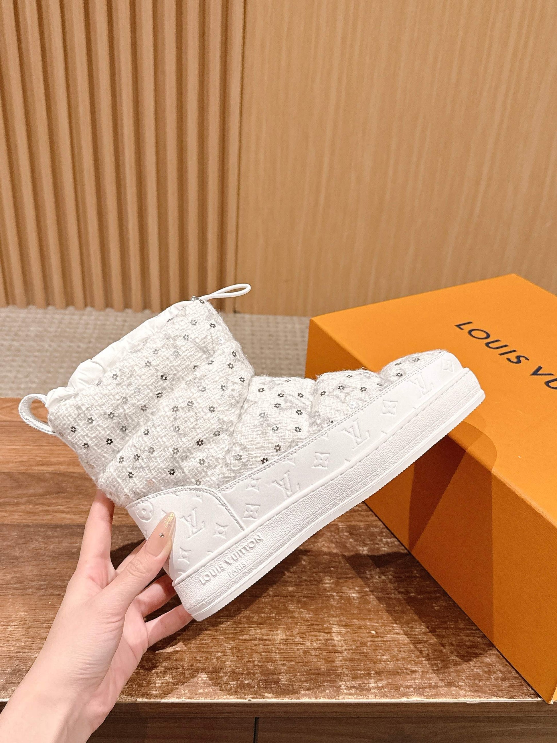 These LV Cloud lace-up high-top sneakers feature a warm and eye-catching design constructed from comfortable sheepskin and classic Monogram canvas, adding another stylish member to the LVSki collection and seamlessly transitioning between skiing and city street style. Cross-lacing details adorn glossy eyelets, while the rubber outsole displays the Louis Vuitton logo.