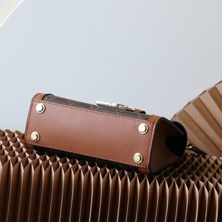 The Dauphine Capitale is a chic one-handle bag made from Monogram and Monogram Reverse coated canvas, with cowhide-leather trim. The bag’s unique trapezoidal shape exudes a luxuriously vintage feel but what makes the Dauphine Capitale really pop is the new elongated version of the magnetic LV lock.