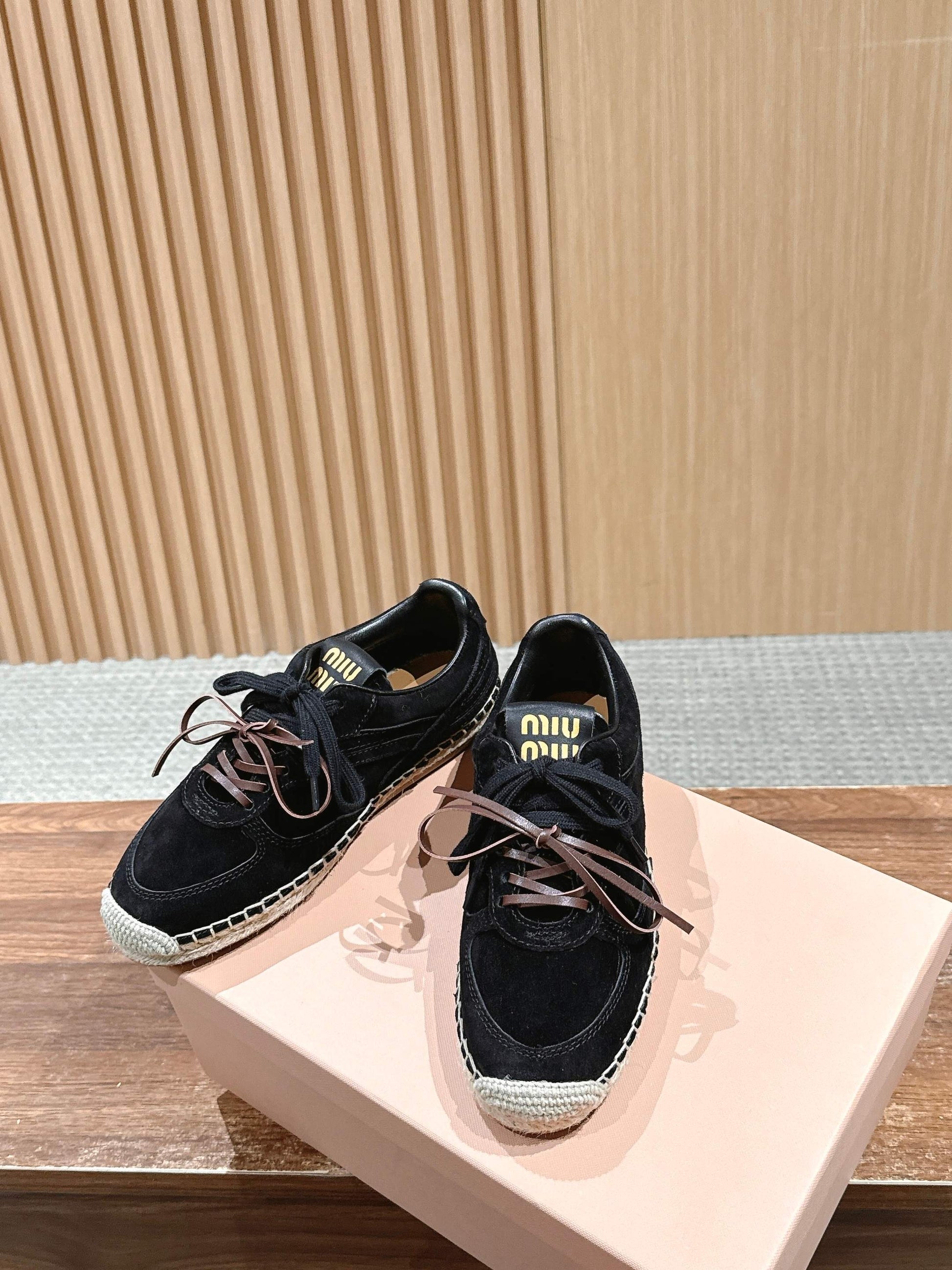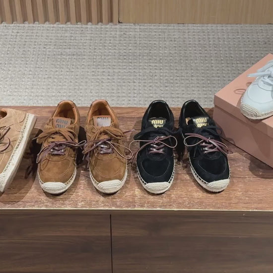 Miu new Fall/Winter woven rope espadrilles, the latest runway collection, a classic upgrade, combining comfort and style. Every color combination is beautiful, and the design caters to different style needs. Made of high-gloss calfskin and hand-woven raffia.