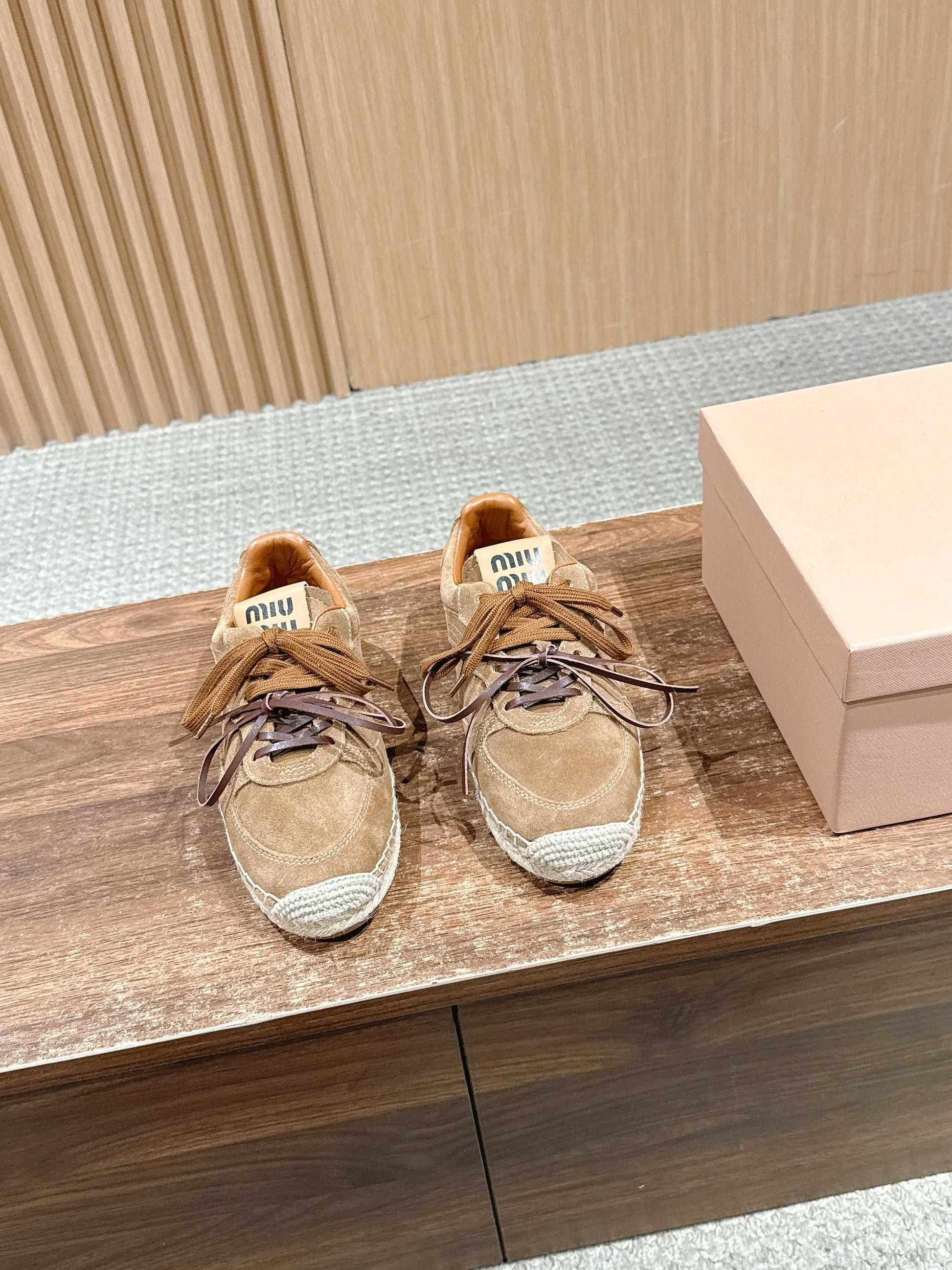 Miu  new Fall/Winter woven rope espadrilles, the latest runway collection, a classic upgrade, combining comfort and style. Every color combination is beautiful, and the design caters to different style needs. Made of high-gloss calfskin and hand-woven raffia.