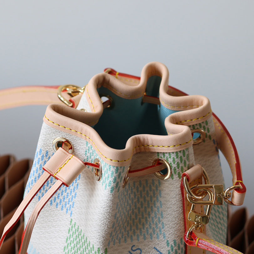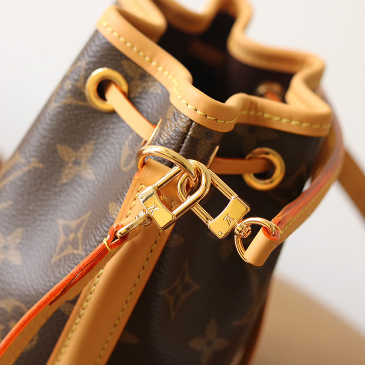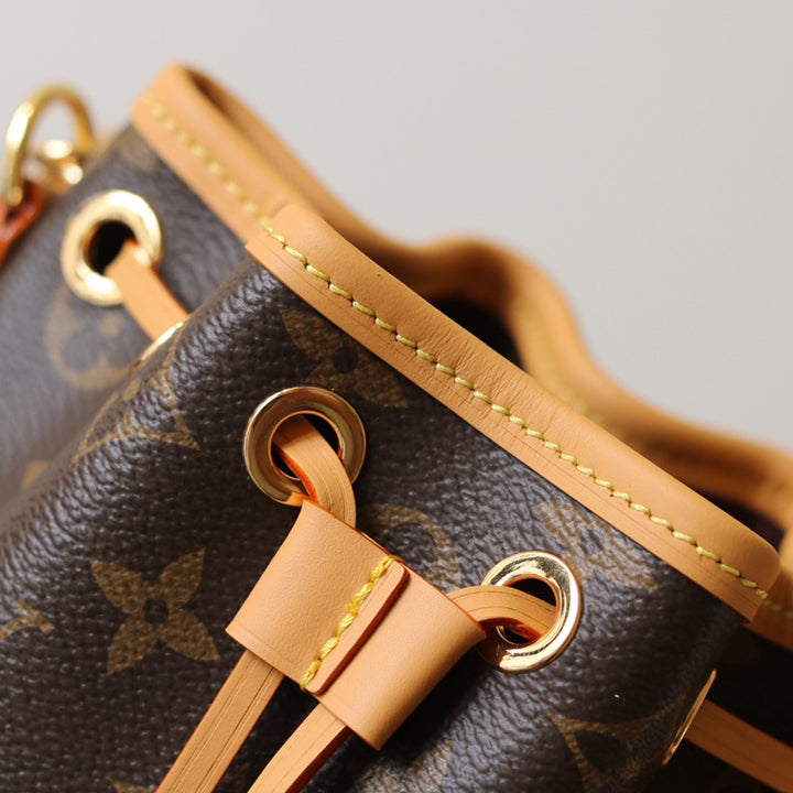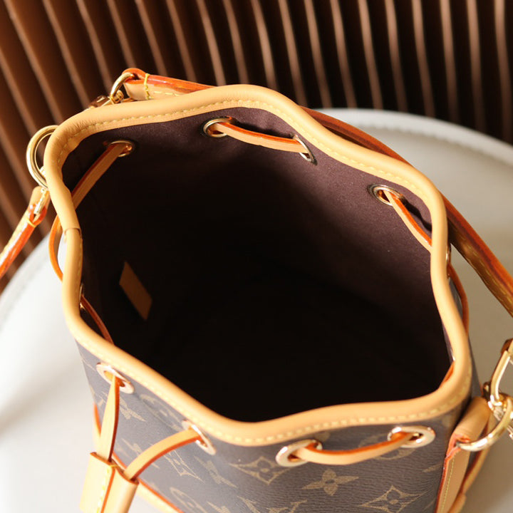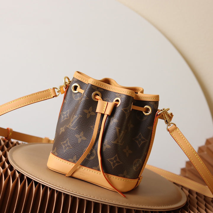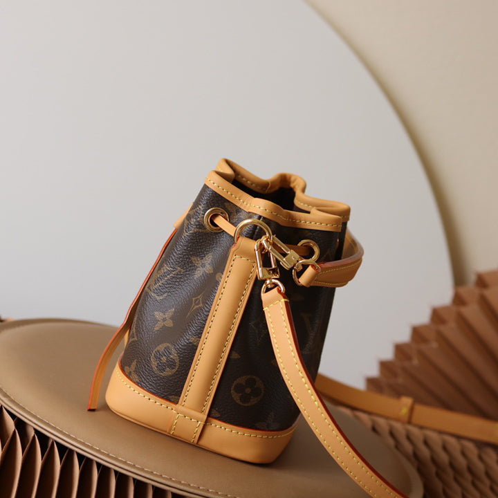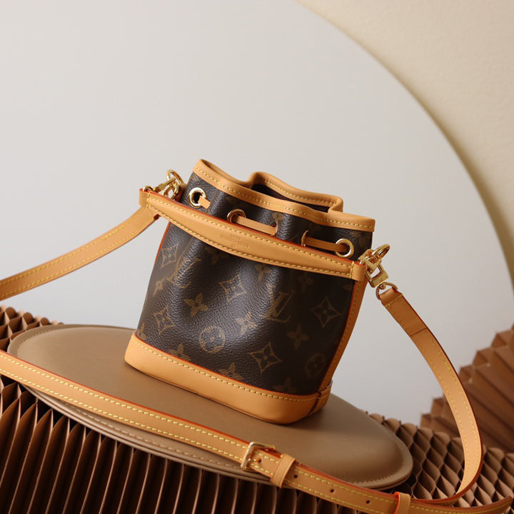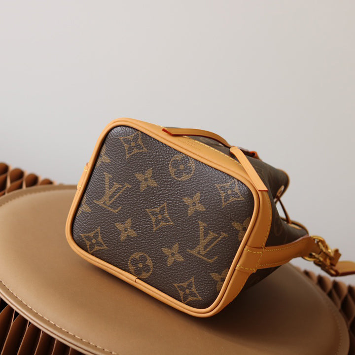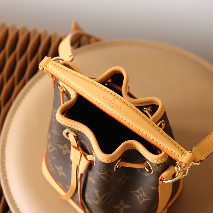 The Nano Noé is a miniature version of the iconic Noé bag, created in 1932. Crafted from Monogram canvas with trim in natural cowhide leather, this tiny Nano Noé combines heritage with modern functionality. Its removable handle and removable, adjustable strap offer multiple carry options, while it is spacious enough to hold essentials including keys, a card holder and a smartphone.