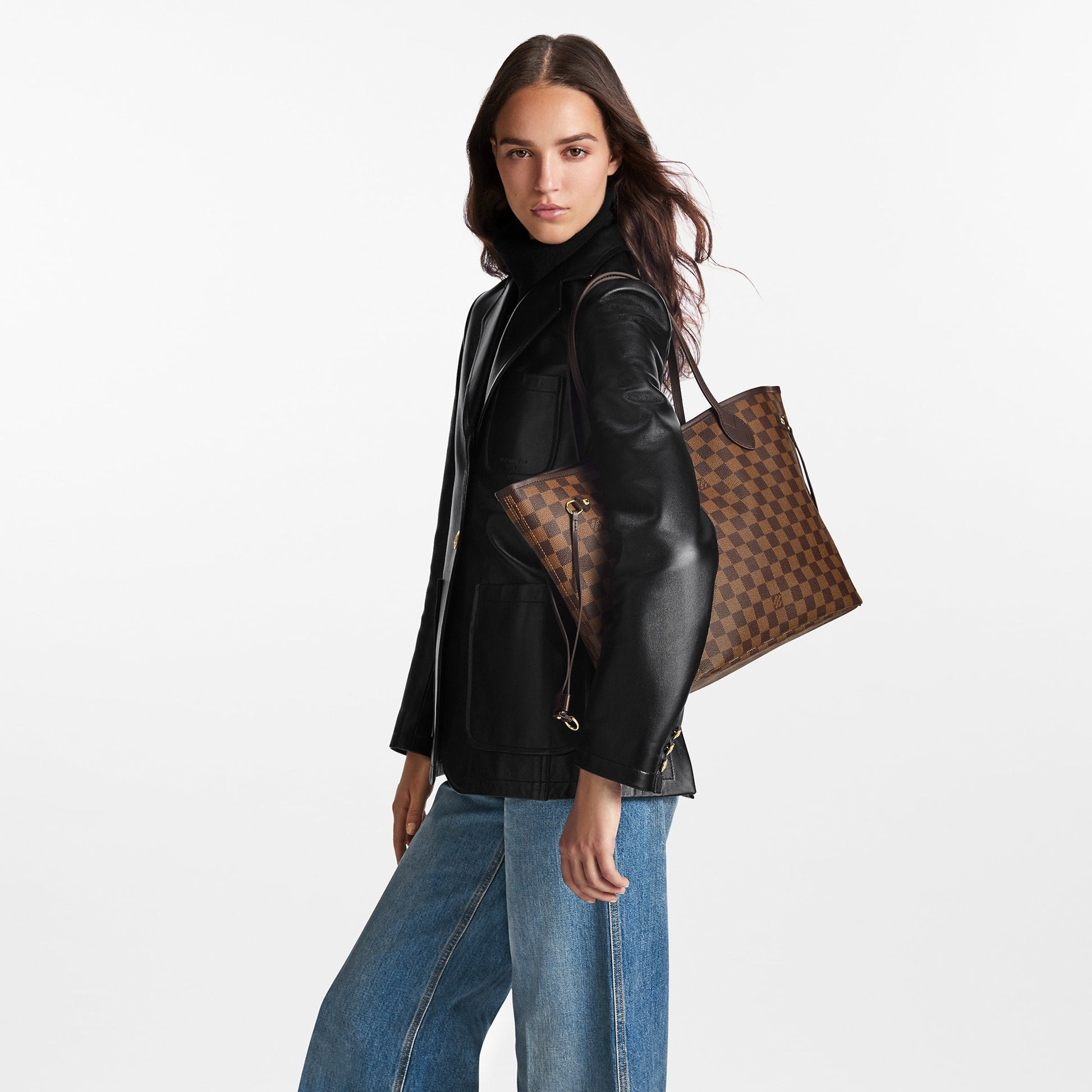 The Neverfull MM tote unites timeless design with heritage details. Made from supple Monogram canvas with natural cowhide trim, it is roomy yet not bulky, with side laces that cinch for a sleek allure or loosen for a casual look. Slim, comfortable handles slip easily over the shoulder or arm. Lined in colorful textile, it features a removable pouch which can be used as a clutch or an extra pocket.