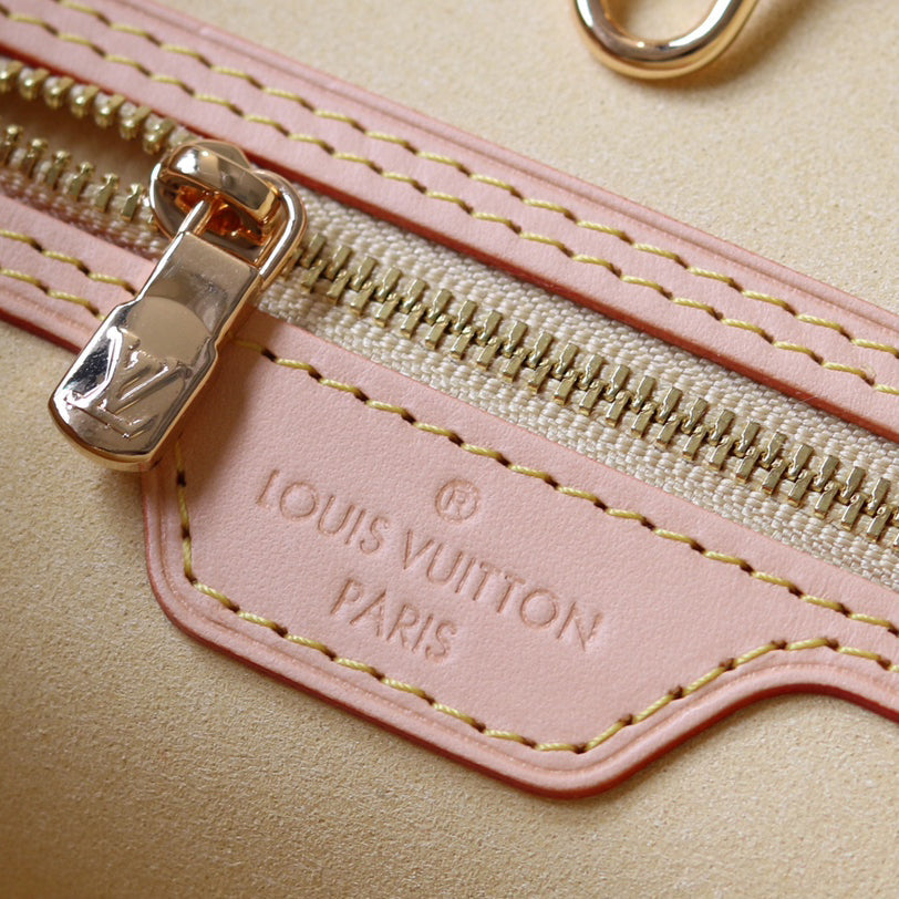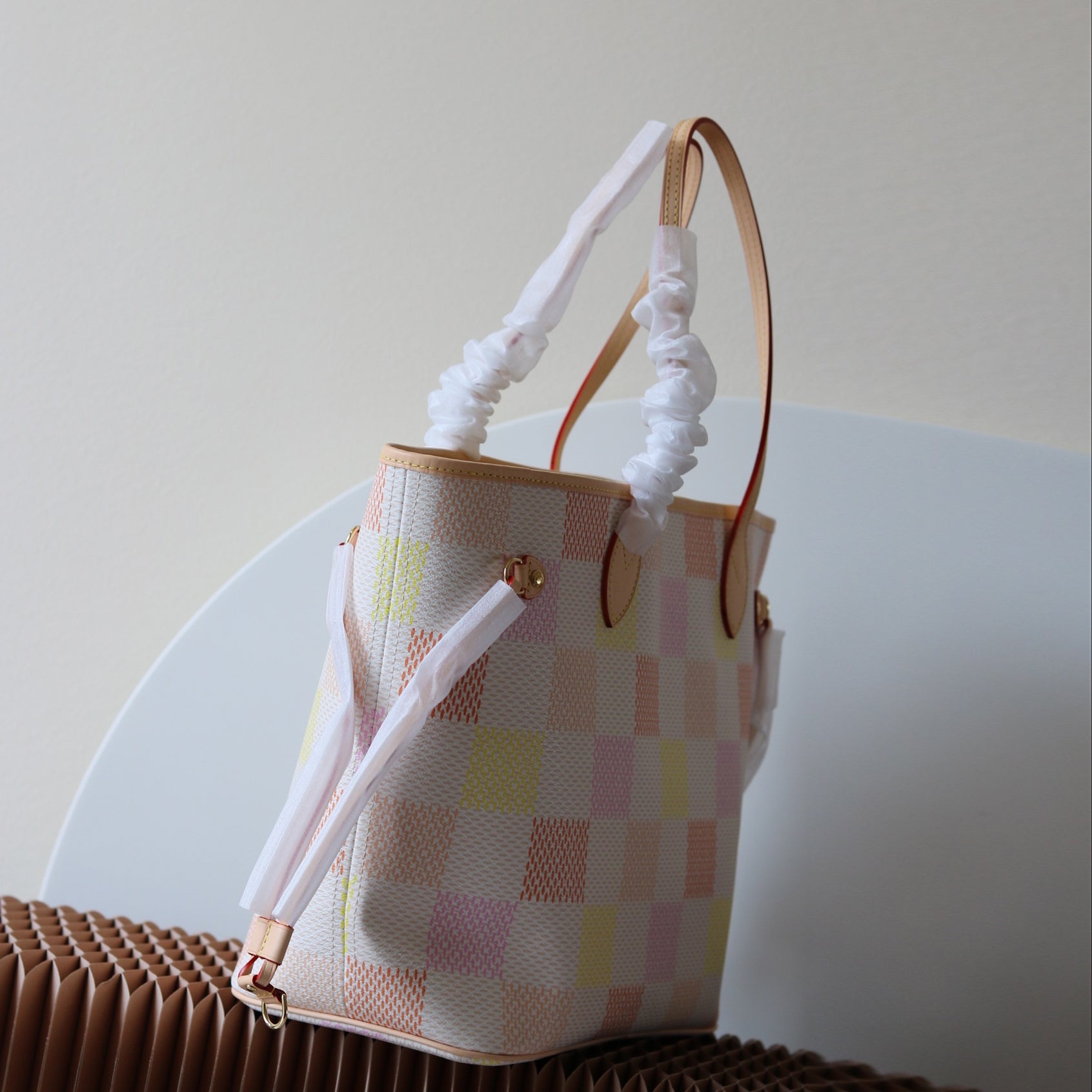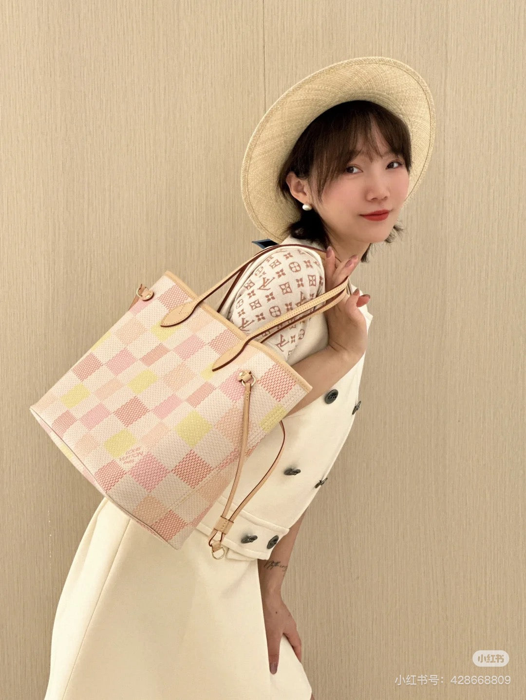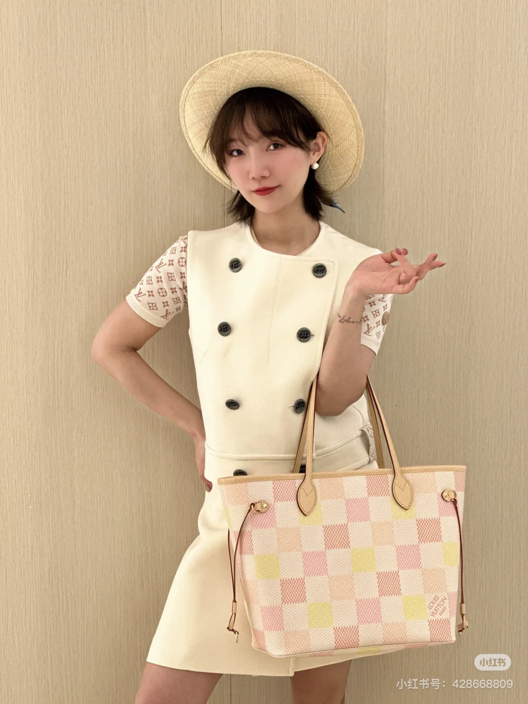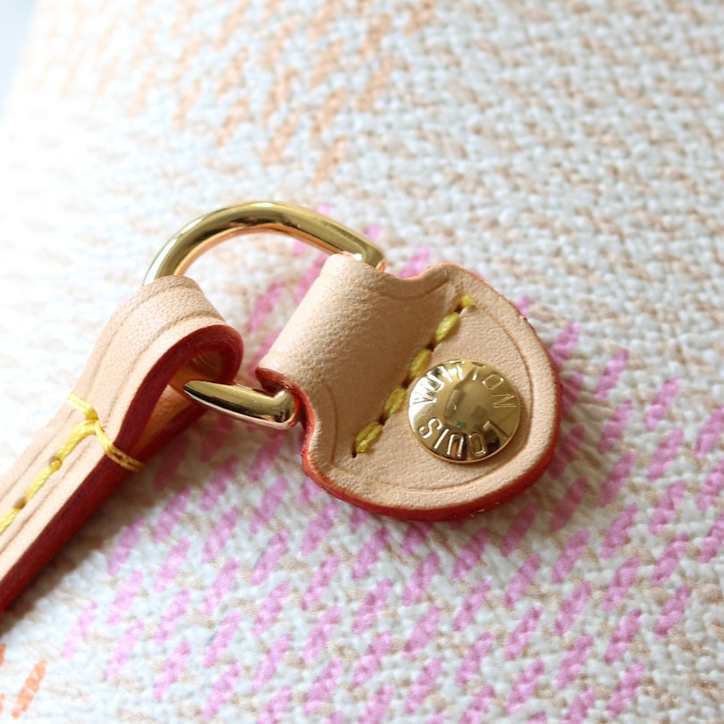 The OnTheGo MM tote bag is made from Damier Giant canvas in a charming colorway that combines four different pastel shades. In addition to two top handles in natural leather, there are two longer straps mounted inside the bag for shoulder carry. Large enough for a 13-inch laptop, this is a practical everyday bag.