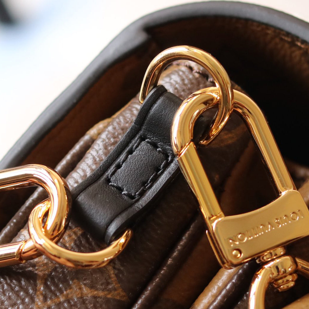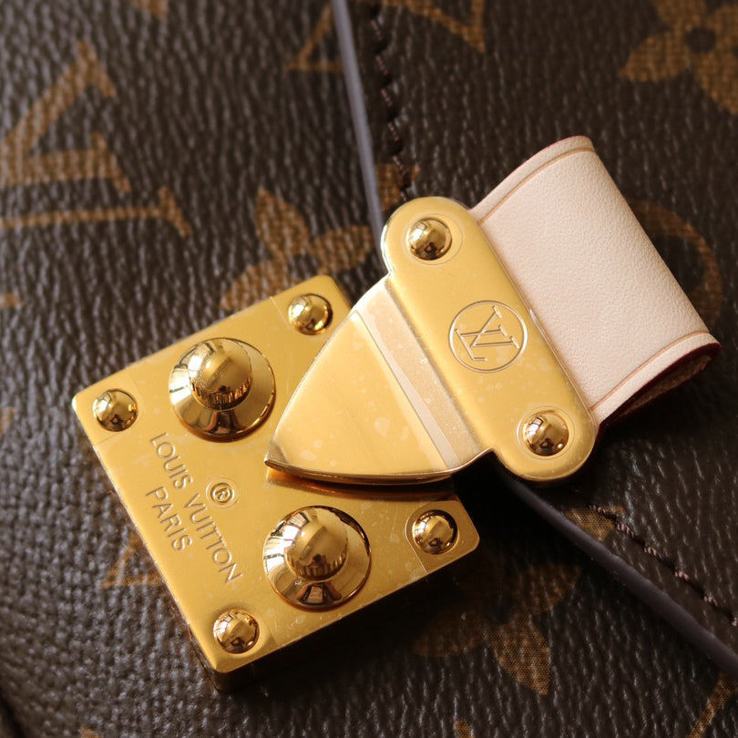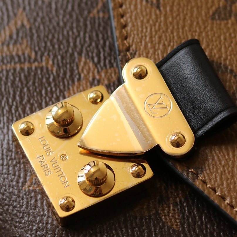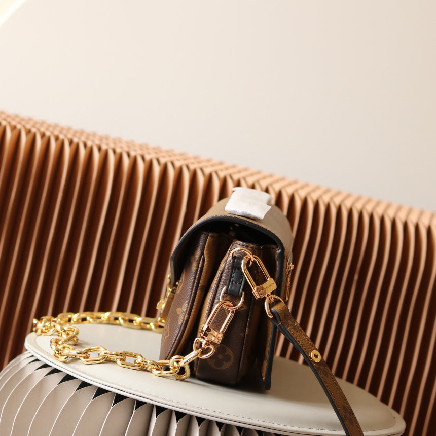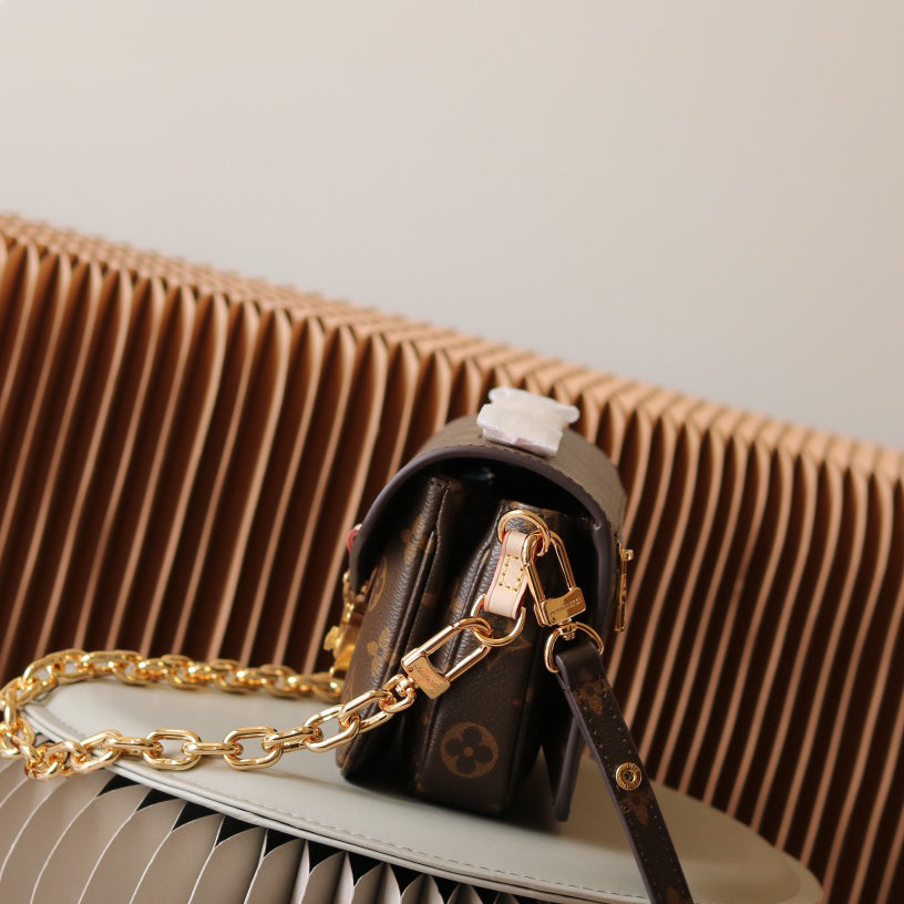 Made from Monogram canvas with natural cowhide-leather trim and the S-lock signature, the Pochette Métis East West bag combines emblematic House cues with new contemporary details like a gold-color chain for fashionable short-shoulder carry. Roomy enough to store an iPhone 13, it has three inside compartments, a zipped pocket inside, and another outside.