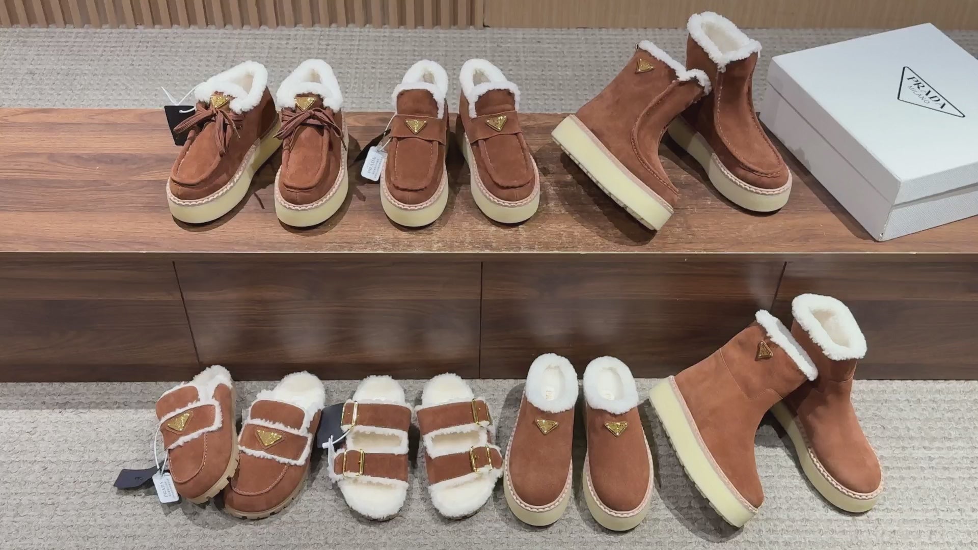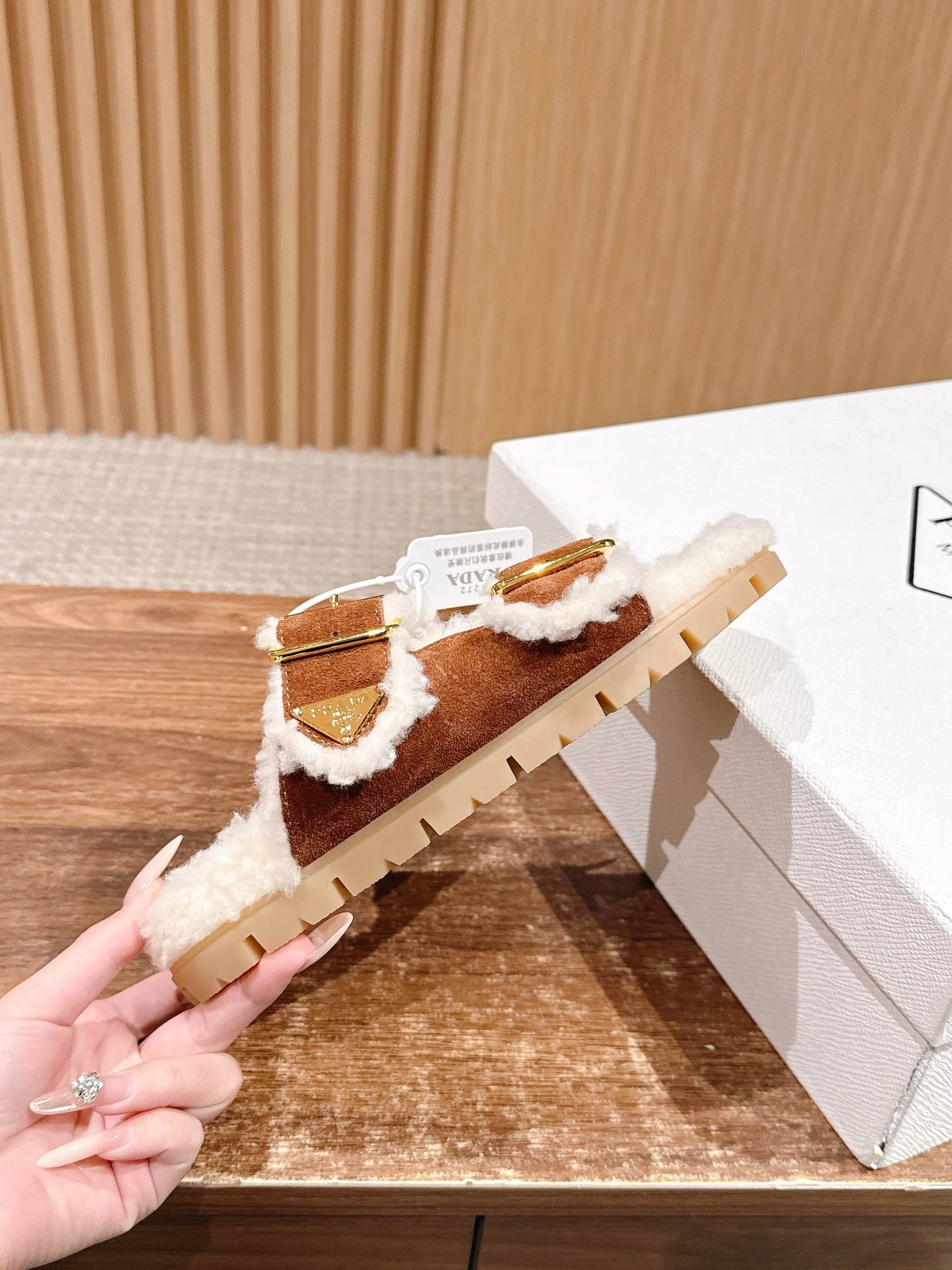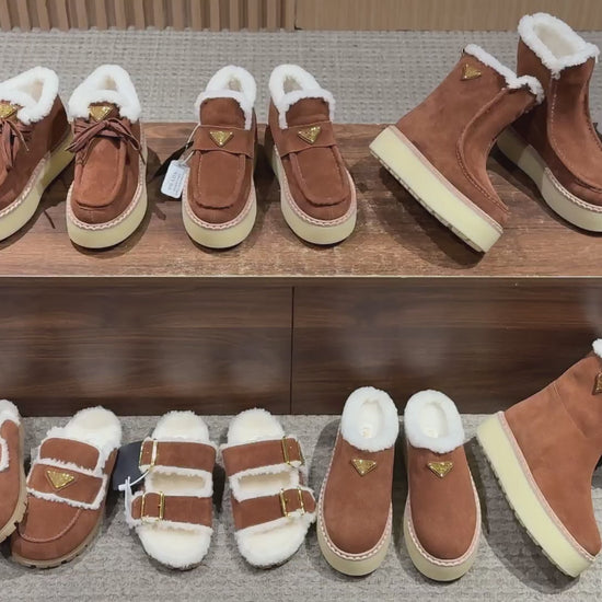 Pra's latest winter hot-selling fur boots and slippers series feature suede triangle logos that add height and make legs appear longer while providing warmth. Stylish and versatile, they are essential items for winter outfits.